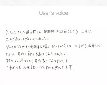 こんにちは、スキンセラピスト吉田純子です。 本日は40代のお客様からいただいたお声をご紹介します。 テンションさんへ通う前は、定期的に出来てしまうニキビ、ニキビあとに悩んでいました。ダーマロジカのを使用する様になってからはニキビも出来にくく …